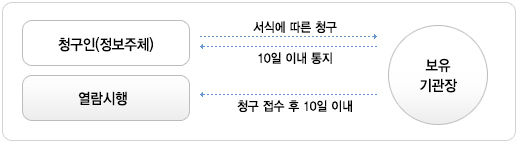 청구인 정보주체가 서식에따른 청구를 하면, 보유기관장은 10일이내 청구인(정보주체)에게 통보한다. 보유기관장이 청구접수 후 10일 이내 열람을 시행한다.