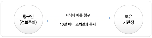 청구인(정보주체) 보유기관장에게 서식에 따른 청구를 하면, 보유기관장은 10일 이내에 조치결과를 통지 한다.